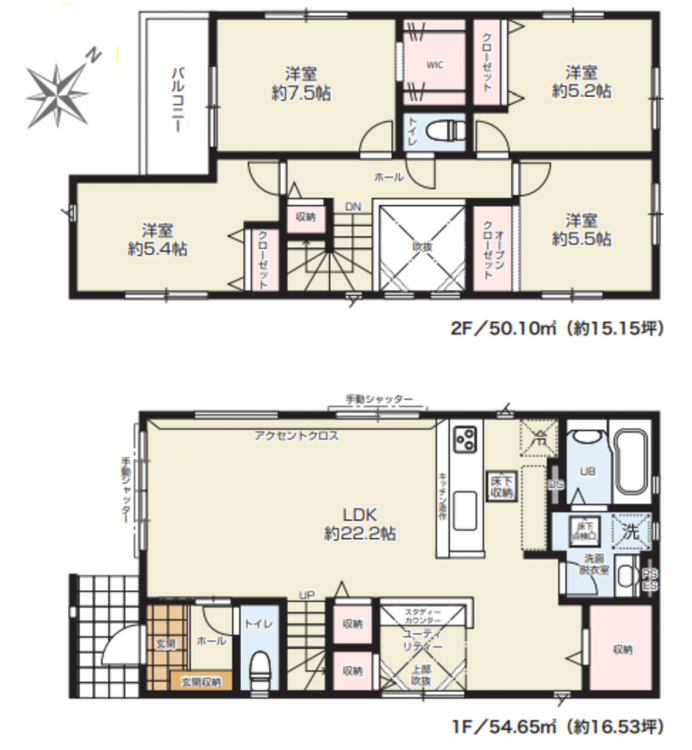 - システムキッチン、カウンターキッチン、食器洗浄乾燥機、洗浄便座、浴室乾燥機、ウォークインクローゼット、駐車場2台分、床下収納、トイレ2箇所、浄水器、吹き抜け、ユーティリティースペース