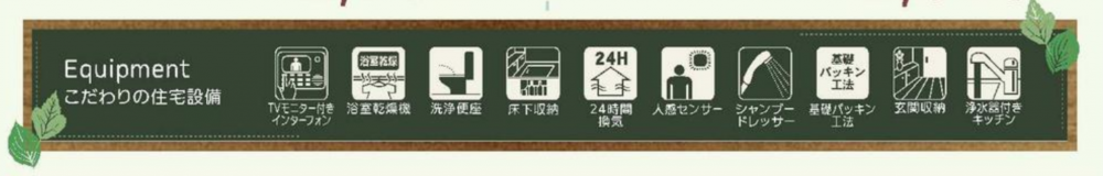 - カウンターキッチン、シャンプードレッサー、洗浄便座、浴室乾燥機、モニタ付インターホン、駐車場2台分、床下収納、浄水器付きキッチン、24時間換気